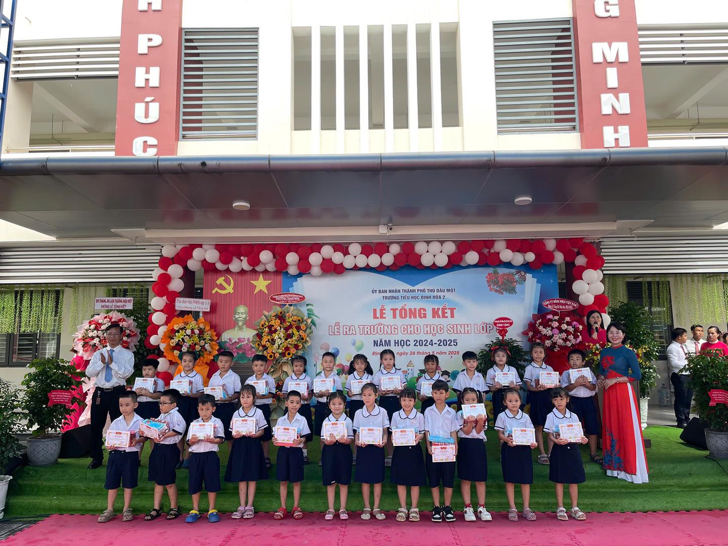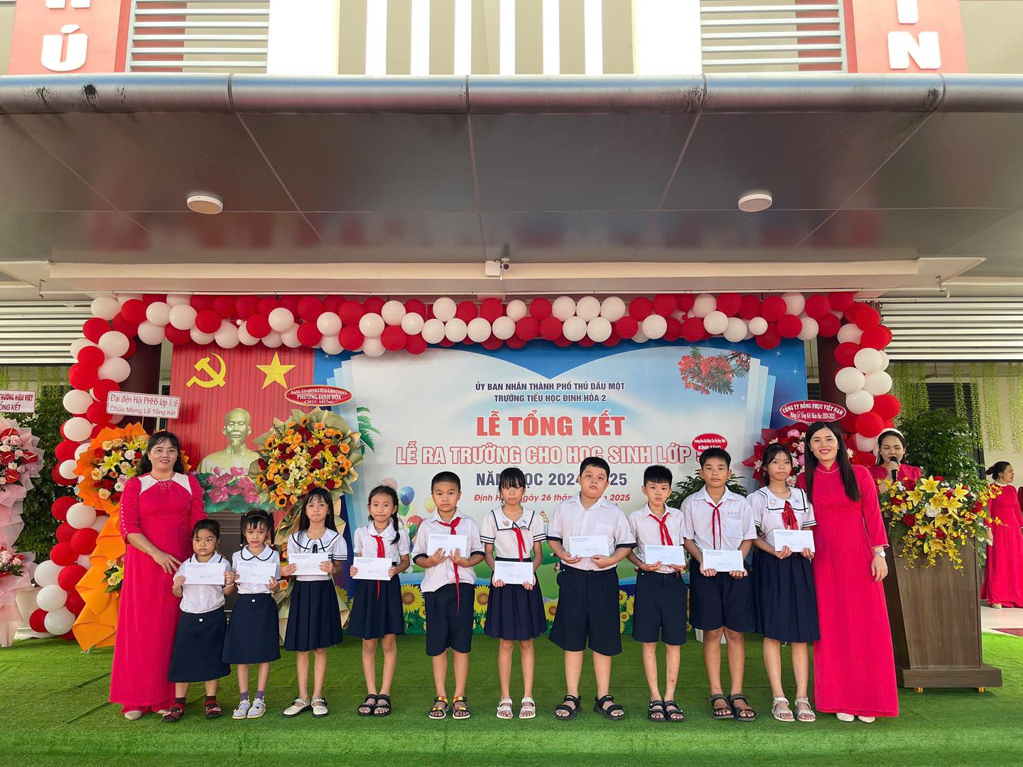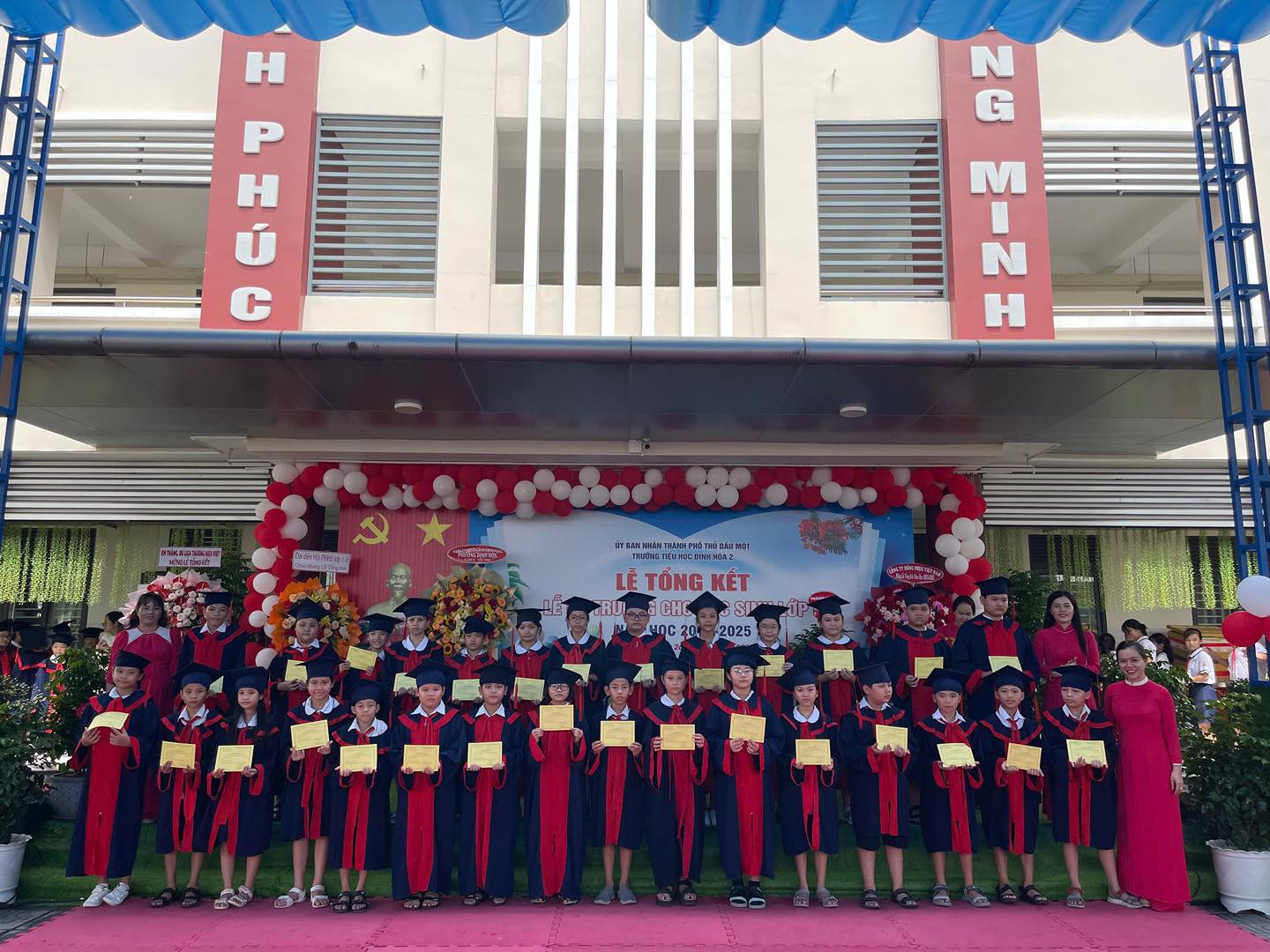Dưới ánh nắng đầu hè rực rỡ, sáng ngày 26/05/2025, trường Tiểu học Định Hòa 2 (TP. Thủ Dầu Một) đã long trọng tổ chức Lễ Tổng kết năm học 2024–2025 và Lễ ra trường cho học sinh Lớp 5. Buổi lễ diễn ra trong không khí trang trọng, ấm áp, là dịp để thầy trò nhà trường cùng nhìn lại hành trình nỗ lực không ngừng nghỉ suốt một năm học vừa qua.